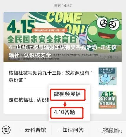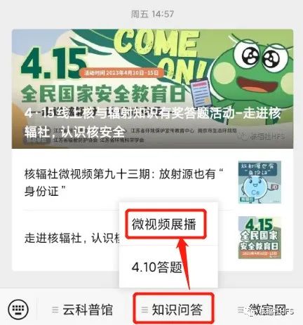 1.在“核輻社HFS”微信公眾號找到【知識問答】菜單,點擊子菜單【微視頻展播】就可以觀看視頻,快來看視頻答題參與抽獎吧!在這里提醒小伙伴們記得答題前觀看視頻,只有全部答對才能參與抽獎哦!參考頁面如下: