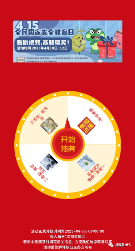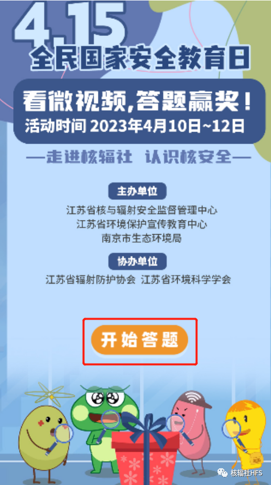今年4月15日是第八個全民國家安全教育日。4月10日至12日,核輻社推出了“看微視頻,答題贏獎”的主題活動。輻蛙社長為大家準備了豐厚的獎品。保證讓您學得充實,玩得盡興,禮品拿不停!