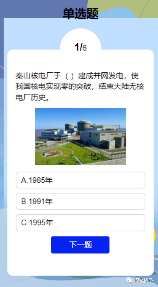 4月10日~12日期間,每人每天可獲得一次看視頻答題機會,每次全部答對后可以參與抽獎!并有機會獲得豐富獎品!每日獎品有限,先答先得哦!小伙伴趕緊來吧!(獲獎名單4月13日在核輻社“HFS微信”公眾號公布。)