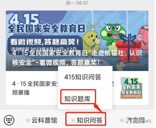 3.獲取答題攻略。你們一定會問,答不出來怎么辦,輻蛙社長早已為大家做好了準備,答題前先點擊“知識題庫”預先學習,活動開始時答題才事倍功半哦!點擊【知識問答】→【知識題庫】獲取題庫內容,開始了解有趣的核與輻射知識吧!