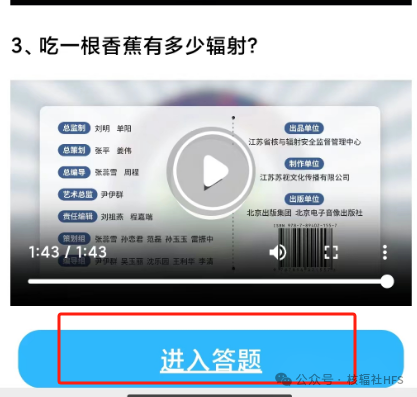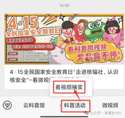 1.小伙伴們要先打開微信公眾號,搜索【核輻社HFS】,關(guān)注后,在“核輻社HFS”微信公眾號的下方菜單欄找到【科普活動(dòng)】,點(diǎn)擊子菜單【看視頻抽獎(jiǎng)】就可以觀看視頻,快來看視頻答題參與抽獎(jiǎng)吧!在這里提醒小伙伴們記得答題前觀看完視頻才可答題,所有題目均出自微視頻,建議大家觀看完微視頻后再參與答題,只有全部答對才能參與抽獎(jiǎng)哦!參考頁面如下: