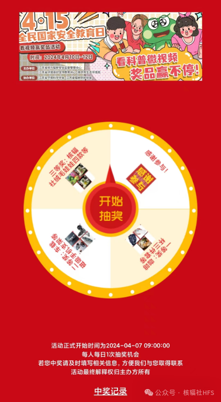 4月10日~12日期間,每人每天可獲得一次看視頻答題機(jī)會(huì),每次全部答對后可以參與抽獎(jiǎng)!并有機(jī)會(huì)獲得豐富獎(jiǎng)品!每日獎(jiǎng)品有限,先答先得哦!小伙伴趕緊來吧!(獲獎(jiǎng)名單4月13日在核輻社“HFS微信”公眾號公布。)