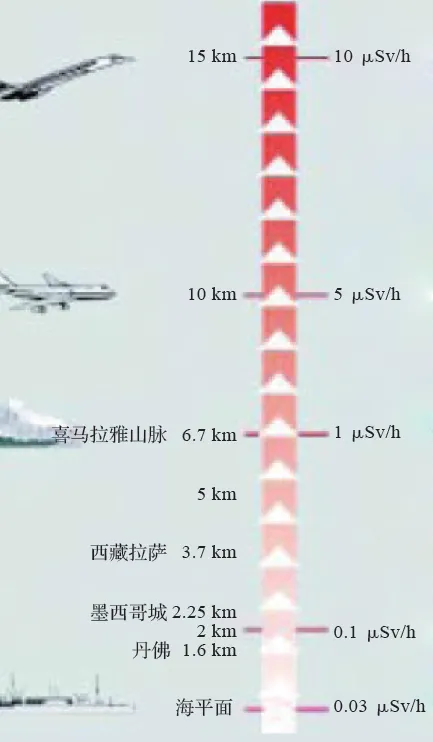 宇宙射線主要是來自外太空的能量很高的粒子,它以基本恒定的數量進入地球大氣層。當宇宙射線穿過大氣層的時候,會與大氣發生復雜的反應并逐漸被吸收,使得劑量率隨著海拔高度的降低而減少。圖1是不同海拔高度處的劑量率。