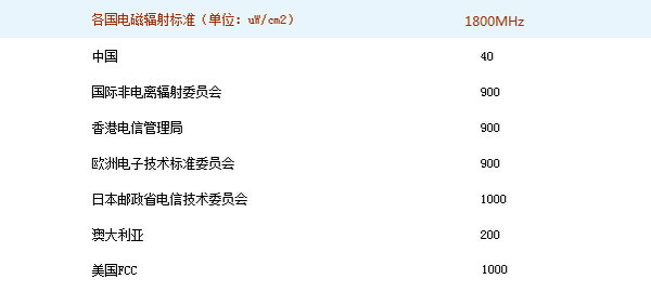 規(guī)定指出,通信頻段功率密度應(yīng)小于40微瓦/平方厘米,與歐洲1800MHz的900微瓦/平方厘米、美國FCC的1000微瓦/平方厘米相比,前、后分別相差20倍與25倍。再來看看離我們最近的香港,香港電信管理局規(guī)定(1800MHz)的電磁輻射標準為900微瓦/平方厘米,兩者相差20倍,可見大陸對電磁輻射把控的嚴格。