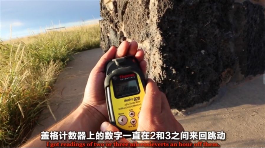 這里是世界上第一顆原子彈進行爆炸試驗的場所,在爆炸中心,小哥發(fā)現(xiàn)了爆炸瞬間高溫形成的玻璃化沙子。檢測發(fā)現(xiàn),這里的輻射劑量為0.8微西弗每小時。而玻璃化沙子的輻射劑量甚至達到了3微西弗每小時!