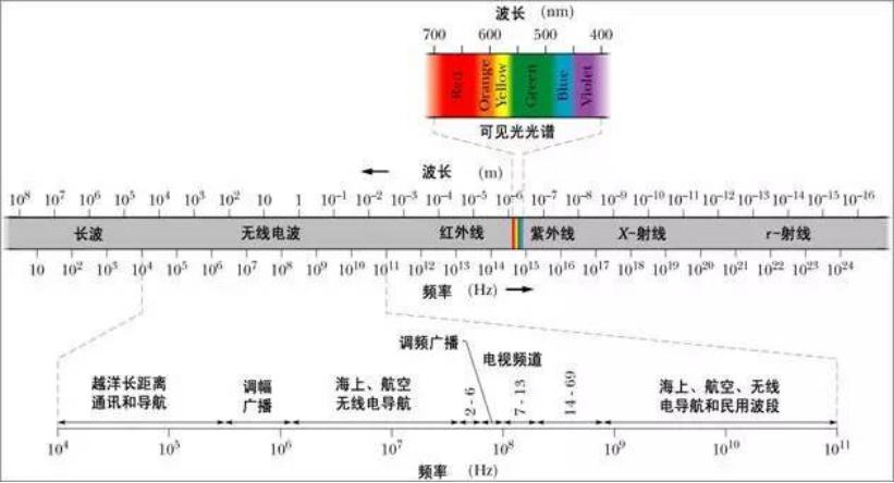 電磁輻射在我們的生活周圍很常見,電磁輻射即電磁能量以電磁波形式或者光量子形式發射或泄漏到空間的現象。它的傳播速度即為人們通常所說的光速。舉例說,正在發射訊號的射頻天線,基站就會向四周輻射電磁波。電磁輻射根據頻率或波長分為不同類型,如圖1所示的電磁波譜。這些類型包括(按序增加頻率):無線電波、微波、紅外線、可見光、紫外線、X射線及γ射線。從圖中我們可以看到,波長最短的伽馬射線僅為千分之一納米,而最長的無線電波波長長達數十米,醫院里CT機的X射線波長在1納米左右。用來殺菌消毒的紫外線比可見光波長短,烤箱產生的用來加熱食物紅外線的波長則比可見光波長長,此外還有微波爐產生的波長為厘米量級,而收音機接受的短波波長為米量級。