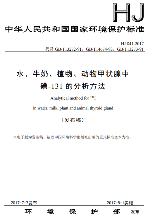 原文下載:水、牛奶、植物、動物甲狀腺中碘-131的分析方法 HJ 841-2017
