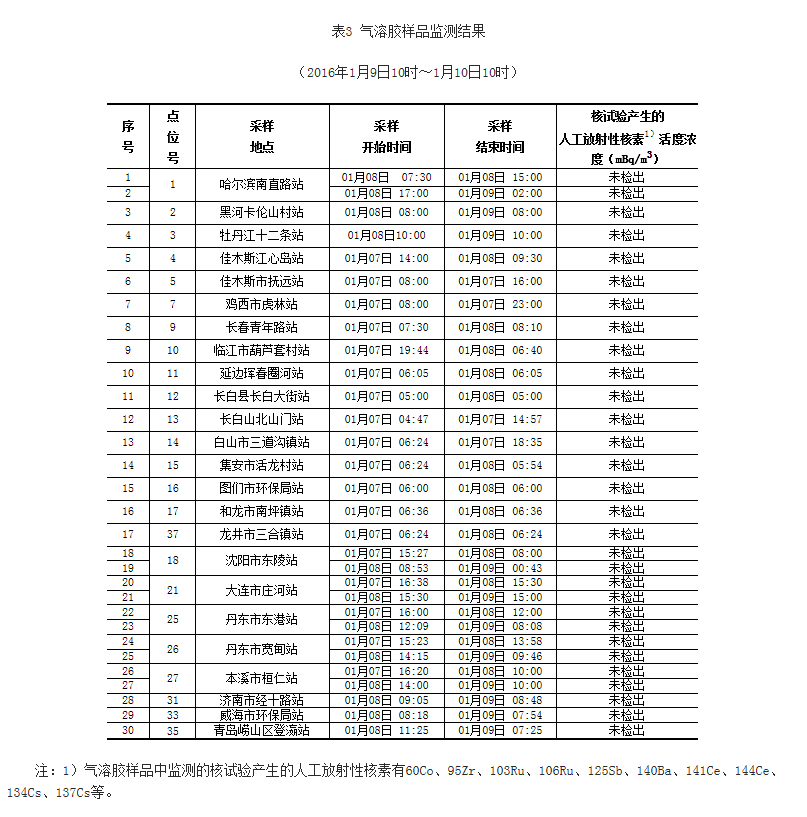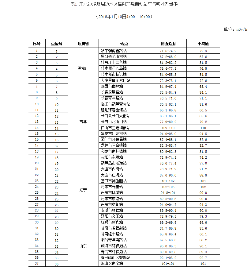 截至到1月10日10時,在東北邊境及周邊地區(qū)布設的37個輻射環(huán)境自動監(jiān)測站實時連續(xù)空氣吸收劑量率監(jiān)測結果處于當地本底范圍內。監(jiān)測數據見表1。