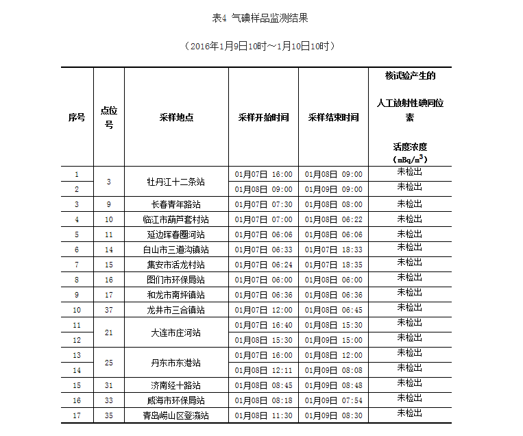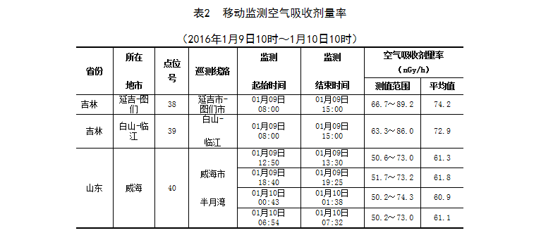吉林、山東省的移動應急監(jiān)測小組空氣吸收劑量率監(jiān)測結果在當地本底范圍內。監(jiān)測數據見表2。