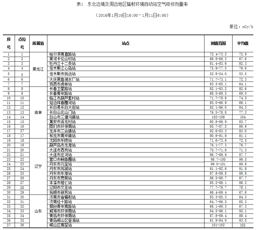 截至到1月11日6時,在東北邊境及周邊地區布設的37個輻射環境自動監測站實時連續空氣吸收劑量率監測結果處于當地本底范圍內。監測數據見表1。