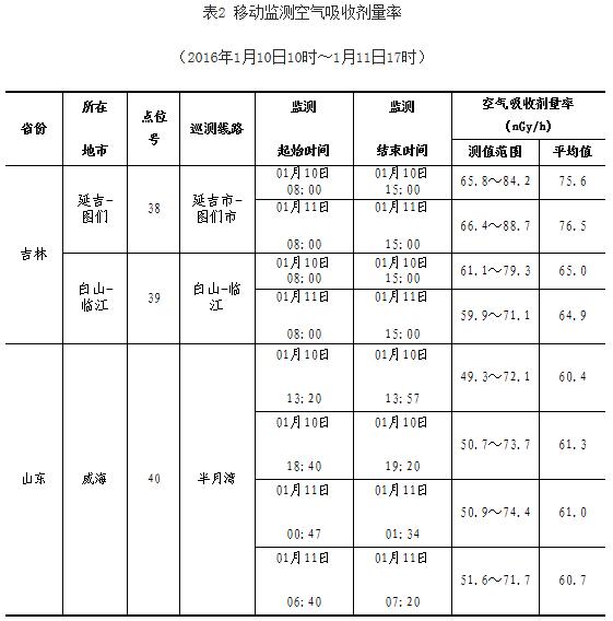 吉林、山東省的移動(dòng)應(yīng)急監(jiān)測(cè)小組空氣吸收劑量率監(jiān)測(cè)結(jié)果在當(dāng)?shù)乇镜追秶鷥?nèi)。監(jiān)測(cè)數(shù)據(jù)見(jiàn)表2。