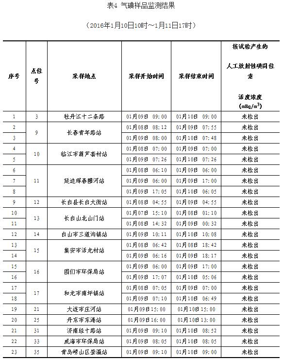 在東北邊境及周邊地區(qū)布設(shè)了24個(gè)氣溶膠采樣點(diǎn)、15個(gè)氣碘采樣點(diǎn)。放射性監(jiān)測(cè)結(jié)果未見(jiàn)異常,未監(jiān)測(cè)到人工放射性核素。監(jiān)測(cè)數(shù)據(jù)見(jiàn)表3和表4。其它各監(jiān)測(cè)點(diǎn)尚在取樣監(jiān)測(cè)中。