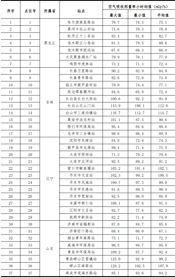 截至到9月10日09時,在東北邊境及周邊地區布設的37個輻射環境自動監測站實時連續空氣吸收劑量率監測數據處于當地本底范圍內。