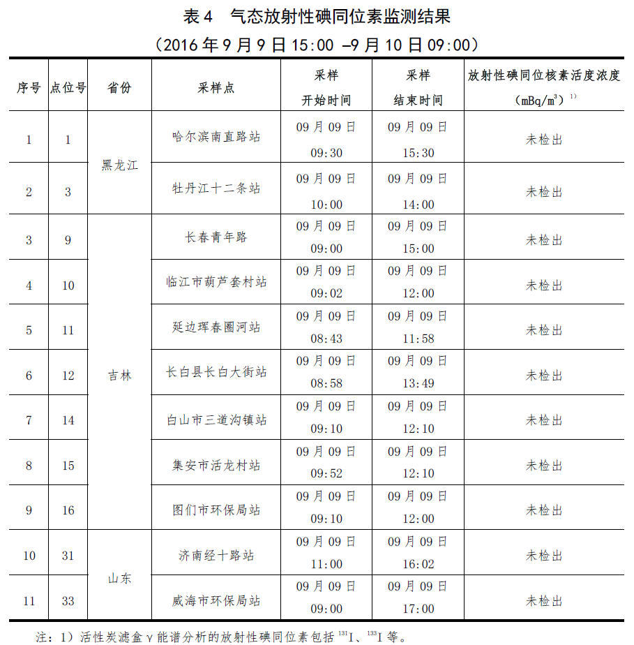 黑龍江、吉林和山東3個省份11個監測點采集空氣中碘,γ能譜分析結果表明,均未檢出人工放射性碘同位素。