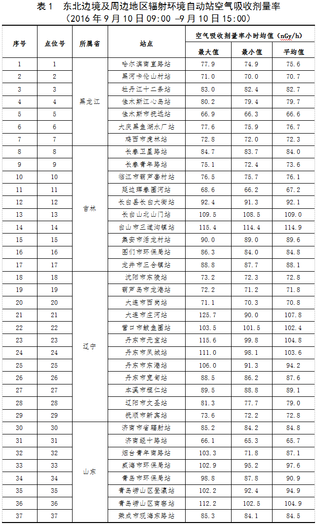截至到9月10日15時,在東北邊境及周邊地區布設的37個輻射環境自動監測站實時連續空氣吸收劑量率監測數據處于當地本底范圍內。