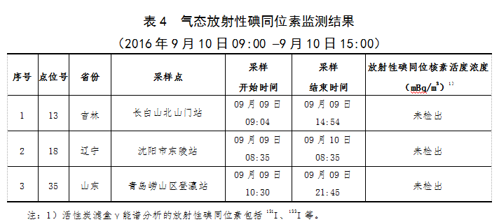 吉林、遼寧和山東3個省份3個監測點采集空氣中碘,γ能譜分析結果表明,均未檢出人工放射性碘同位素。